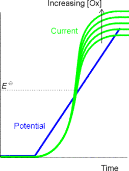 Note the gradual increase of current with voltage around the Eo.  Current (coulombs per second) is a measure of the rate of the electrochemical reaction.  The reaction starts slowly at first but is driven faster as the voltage is increased.  Note also the levelling off of the current to form a plateau.