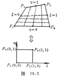 [ Bidirectional distance coordinates ] Starting from a vertex of the quadrilateral, define the distance coordinates on the two adjacent sides ; then define the distance coordinates in the same direction on the opposite edge . Connect , and the variable points with the same distance coordinates into straight line segments to form a local coordinate network. So any point P of the quadrilateral is a node of the coordinate network , and its local coordinates ( ξ , η ) can be taken separately , and the second distance coordinate of the two line segments (ie ). In this way , a one-to- one correspondence is established between quadrilaterals in the Cartesian coordinate system and element squares ( 0 ≤ ξ ≤ 1 , 0 ≤ η ≤ 1 ) in the local coordinate system ( Figure 19.3 ) .![]()